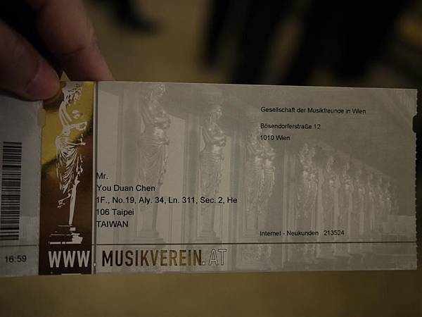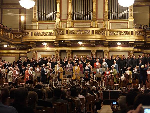 回旅館休息片刻後,晚上還有音樂饗宴等著我們哩!我們訂了晚上8點15分在愛樂協會演出的莫札特管絃樂,怎知7點半到時裡頭竟然擠滿了人!看來大家都是要買票或領票的,有人插隊也無人管,在一片混亂之中領到了票(怎麼和高水準的愛樂不太協調)