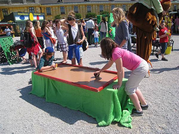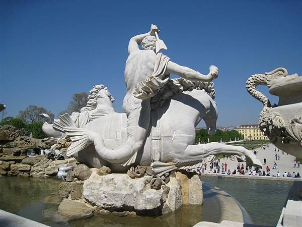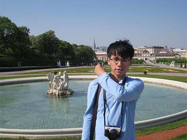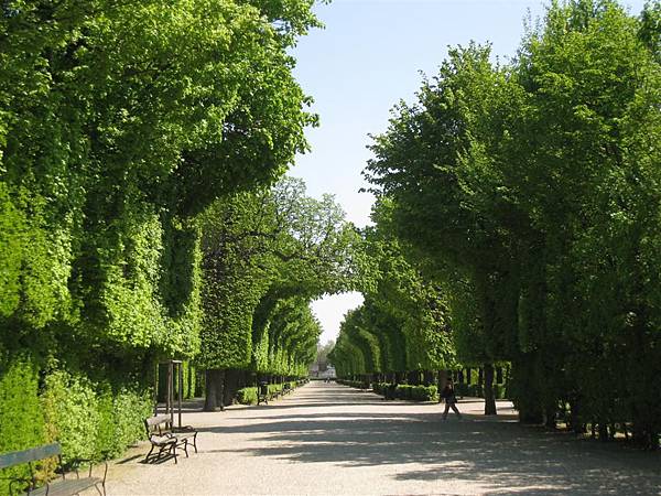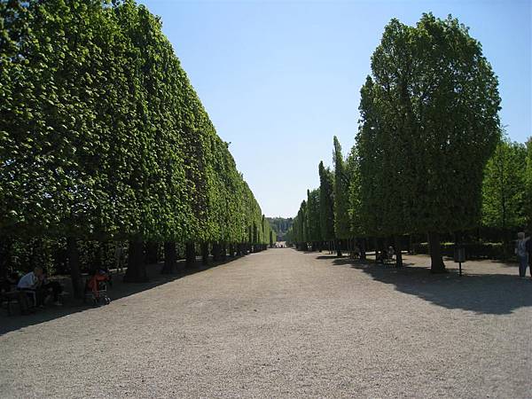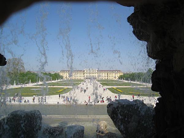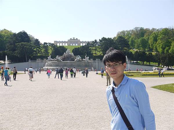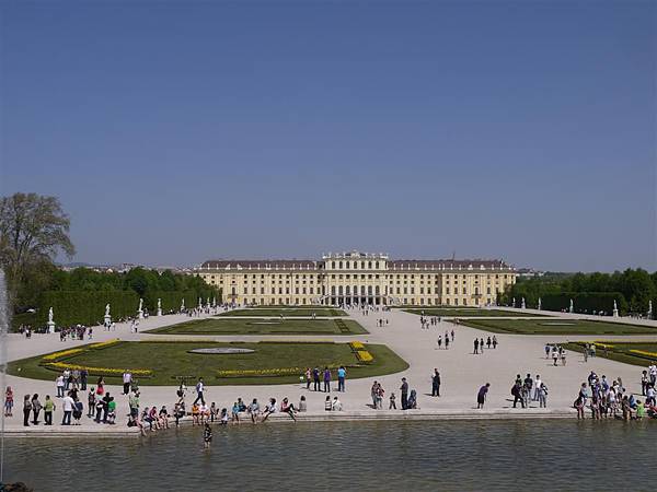 排隊買票時發現人山人海,聽可芸說這兩週剛好是復活節假期,果然買了票要等1個多小時指定時間才能入場,怎麼跟之前看熊貓一樣要抽時間牌啊?趁等待的時間到熊布倫宮的花園噴泉走走,雖然宮殿外型不是非常華麗,但花園整理的很整齊漂亮,整齊的樹木很有特色。
