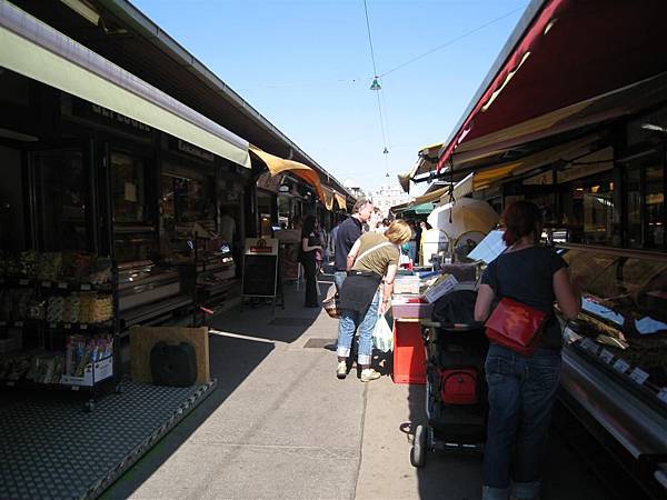 離開熊布倫宮,搭地鐵到納緒馬克市場,原本中午有排餐廳,但又端說不太餓,因此就到市場晃晃覓食。市場綿延了好幾百公尺,不過賣的東西大同小異,都是蔬果、cheese、肉類乾貨等,我一直想找剛剛看的Kaiserschmarren,可惜都沒有。