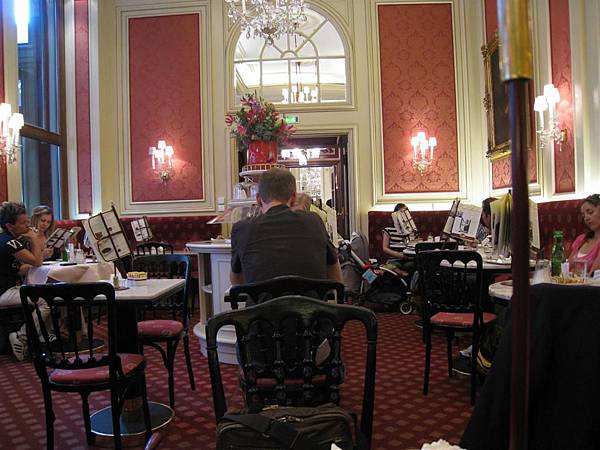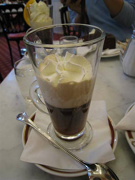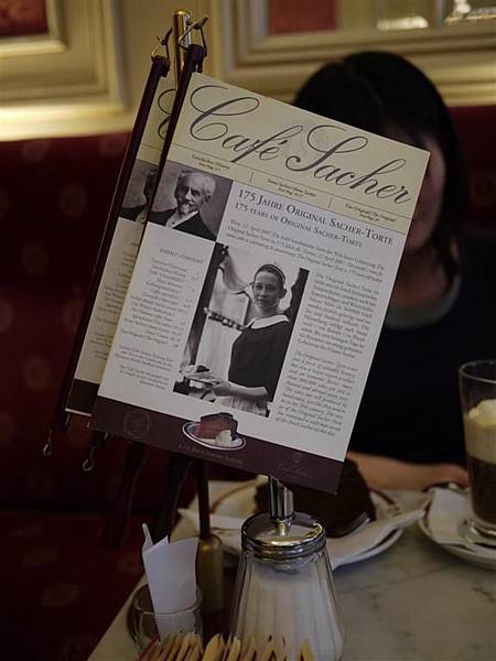 下午茶時間果然高朋滿座,還好沒等待很久就可入座。我們點了兩個Sacher cake,咖啡我點書上介紹的維也納咖啡Einspanner,又端點Maria Theresia