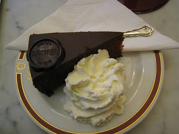Sacher蛋糕。蛋糕雖然滿甜的,不過裡面有夾一層帶酸的果醬,中和起來很可口。
